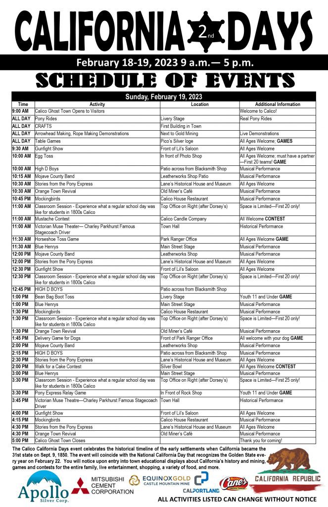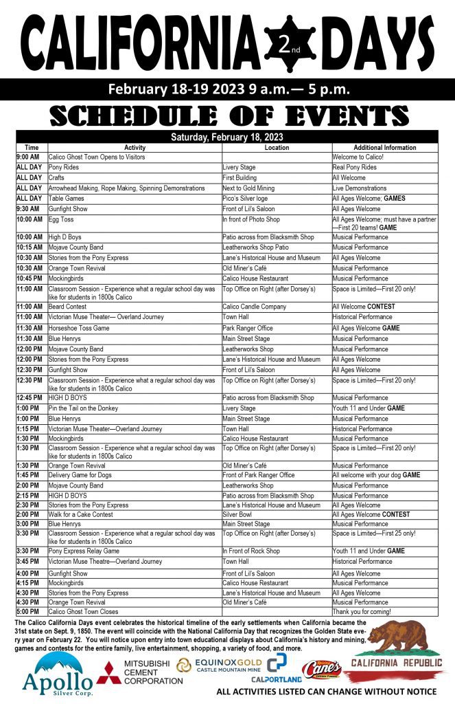 Calico will be open from 9 a.m. to 5 p.m. Prices are $10 per adult, $5 children ages 4-11, and 3 years and under are FREE. For more details and a daily schedule of events, visit parks.sbcounty.gov/calico-california-days.