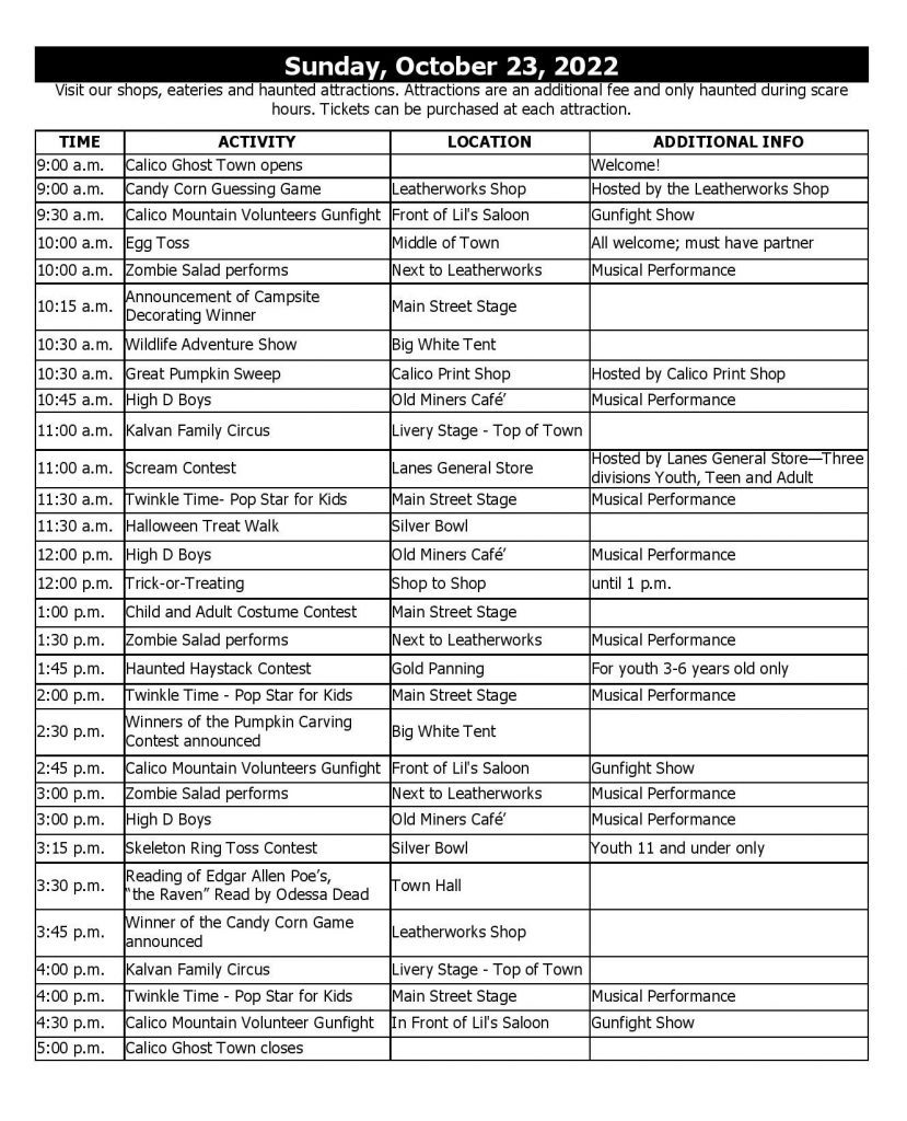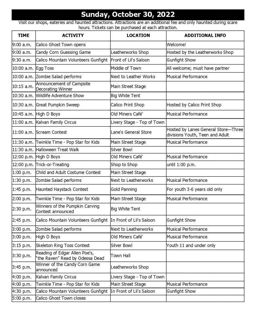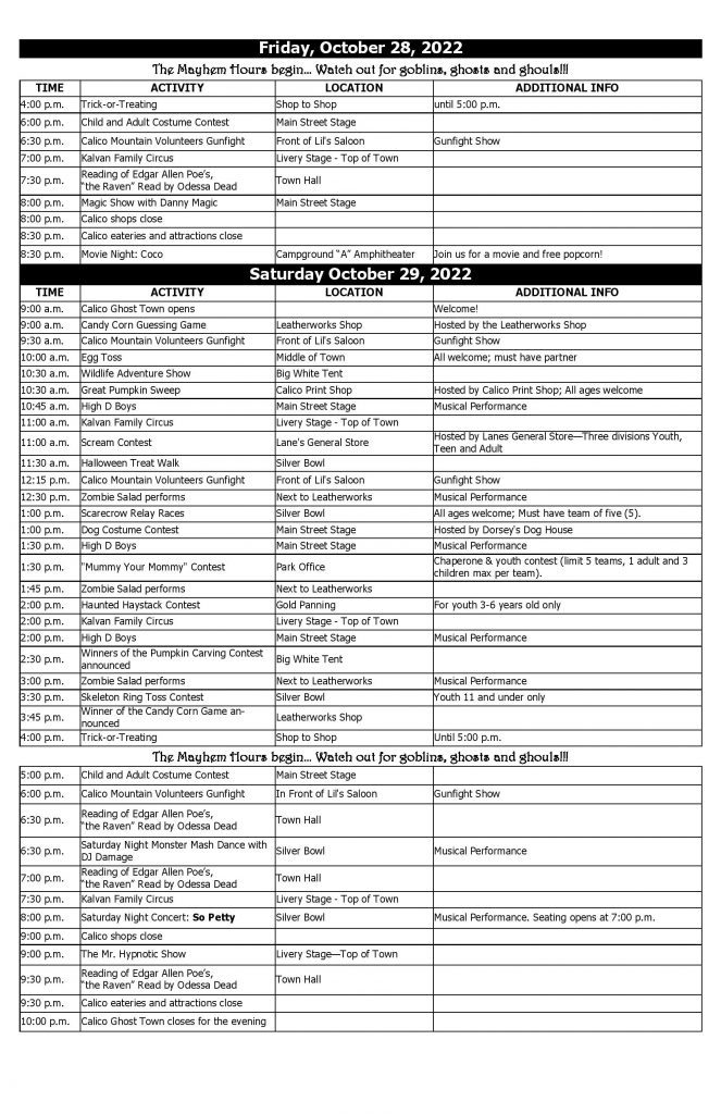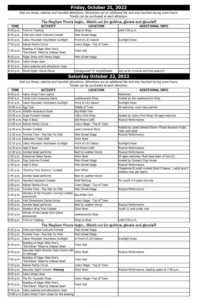 Every year, Calico Ghost Town brings out the scare, fun and excitement of Halloween. This annual event includes, trick-or-treating, costume contests, pumpkin carving, kids’ carnival tent, live entertainment stage shows, haunted attractions and more.