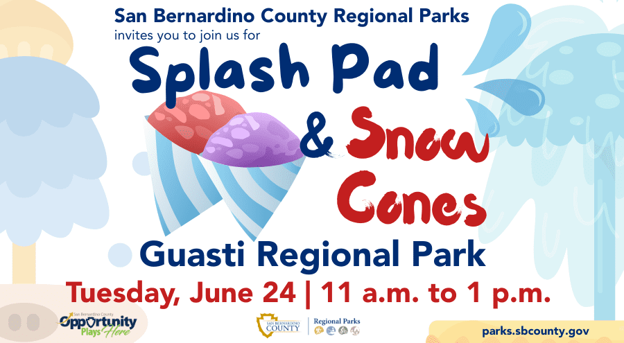 Cool off & play the day away! Join the San Bernardino County Regional Parks’ Team for a fun-filled day at the splash pad, complete with exciting games, refreshing snow cones, and a hands-on environmental science adventure! We’ll kick off the day with an engaging oil spill simulation, where kids get to step into the role of conservationists, working together to clean up a pretend ocean disaster. This interactive activity will teach valuable lessons about protecting our waterways and the impact of pollution on marine life. Then, dive into the fun with splashing water play, classic lawn games, and icy treats to beat the heat! Whether you’re racing through sprinklers, tossing bean bags, or just relaxing in the sun, it’s the perfect way to enjoy summer while learning about nature. Don’t miss out on the ultimate family fun day—grab your swimsuits, towels, and game face, and we’ll see you there!