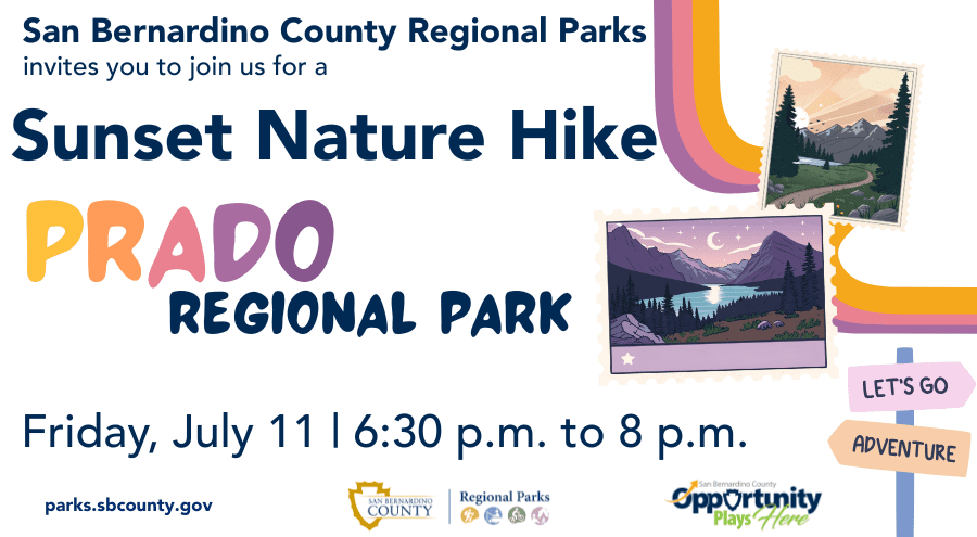 Adventure awaits! Join us for a scenic and educational nature hike through San Bernardino County’s beautiful Prado Regional Park, no registration required. As we explore winding trails, we’ll learn about local wildlife, native plants, and the rich history of the area—all while soaking in the fresh air and connecting with the great outdoors. The best part? We’ll end our journey with a breathtaking sunset view, painting the sky in stunning shades of gold, pink, and purple. Don’t miss this perfect way to unwind, learn, and take in nature’s beauty!
