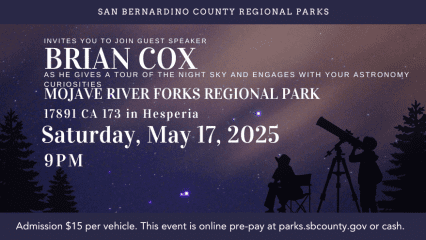A overhead view of the pool at Yucaipa Regional Park with mountains and waterslides in the background with a blue sky. People are seen in the lagoon-style pool with people on the sandy beach area around the pool.