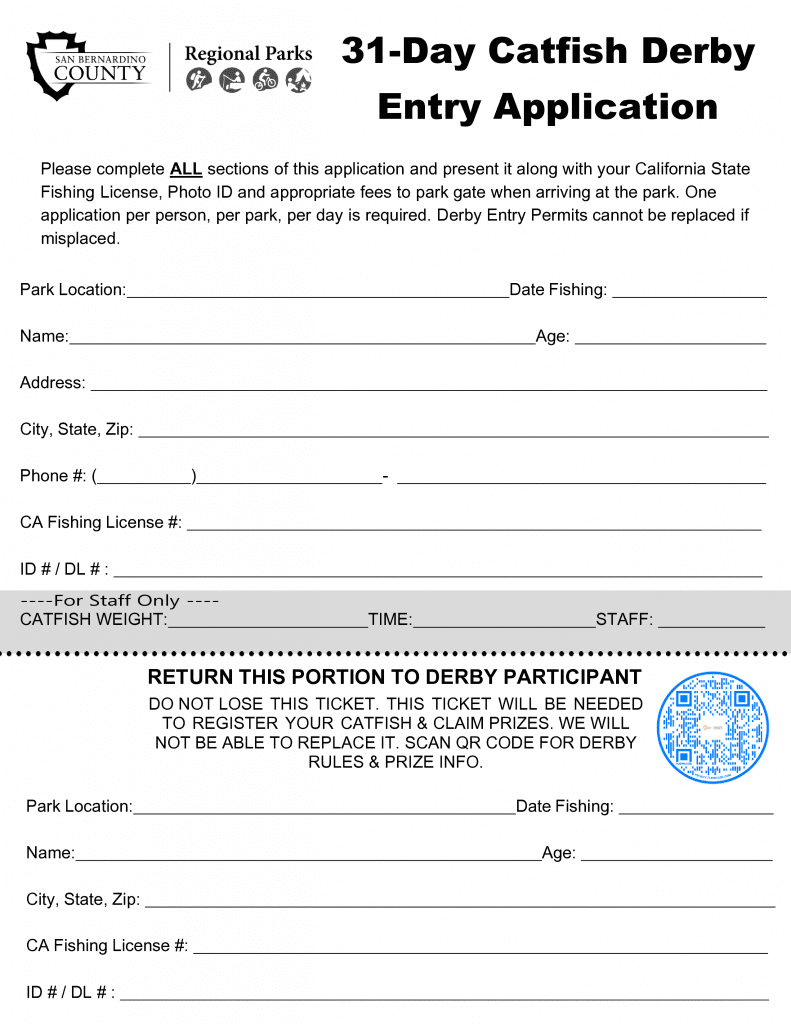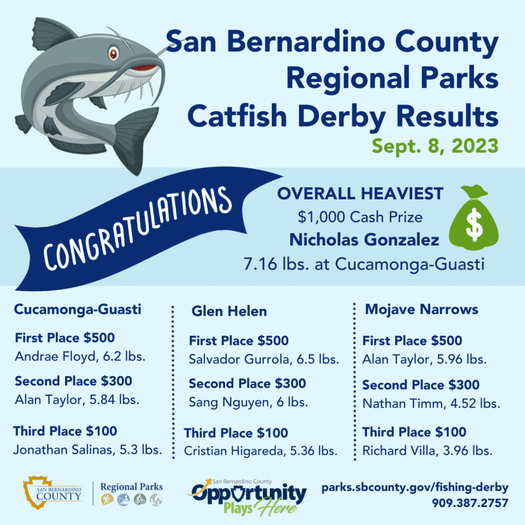 Regional Parks will have a weigh-in station available and encourages participants to allow plenty of time to weigh and enter their fish prior to the 1 p.m. cut-off time. Winners do not need to be present to claim their prize(s). Winners will be announced at approximately 1:15 p.m. at the Regional Parks weigh-in station area.
