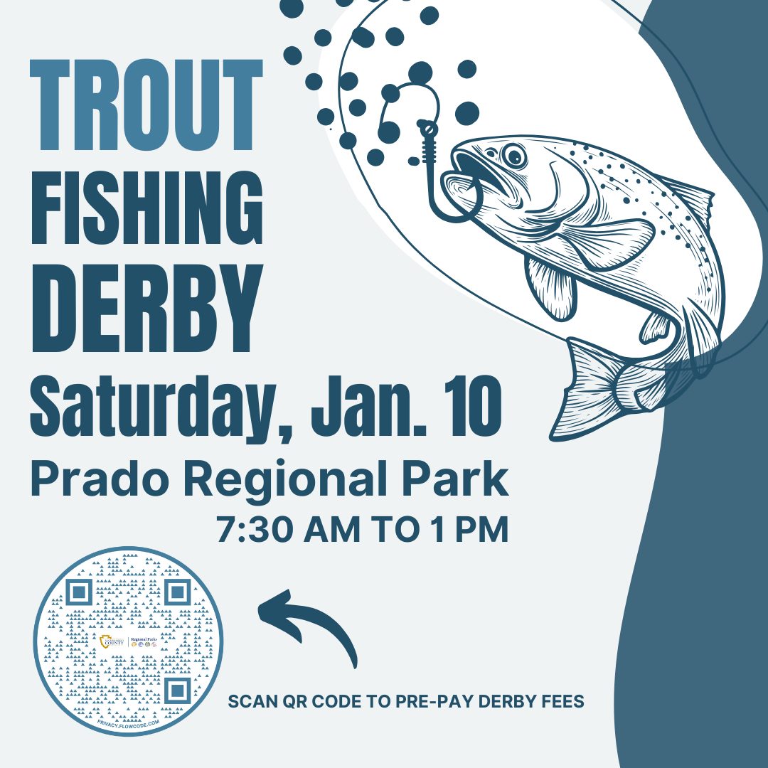 Regional Parks is excited to welcome back the one-day trout derby at Prado Regional Park on Saturday, Jan. 10, 2026, from 7:30 a.m. to 1 p.m. Gates open at 6:30 a.m. and pre-paid derby fees are encouraged. Derby fees are $20 per person and $15 per vehicle. A fishing license is required for all participants ages 16 years and older.
