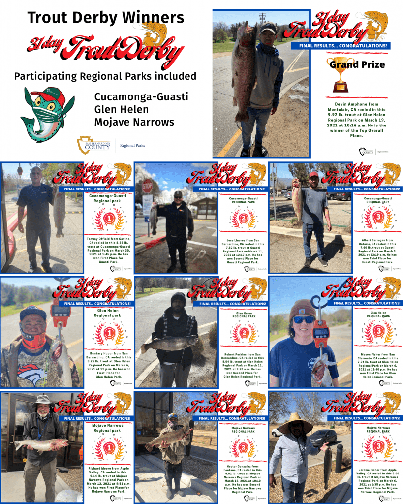 Cucamonga-Guasti Regional Park offers the sport of fishing year-round at our two lakes. We stock trout from November to April and Catfish from May to September. A California state fishing license is required to fish at our parks and we offer fishing workshops and derbies throughout the year.