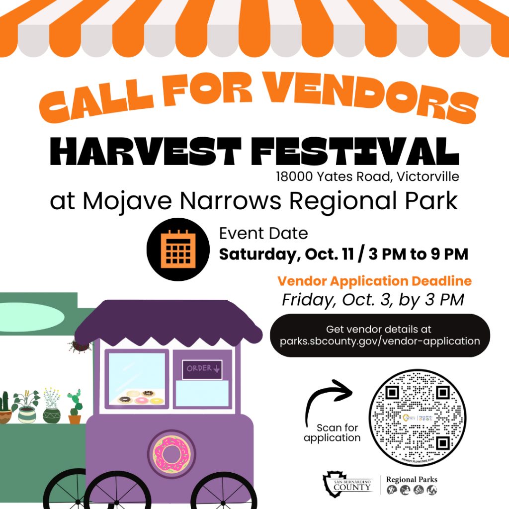 Regional Parks has an amazing opportunity for vendors! We invite you to join and be part of our well-attended vibrant events throughout the year! San Bernardino County Regional Parks is always looking for vendors to be part of our exciting family and pet-friendly events that attract thousands to our annual events each year. Booth vendor items can range from food and merchandise to pet accessories and handcrafted items.